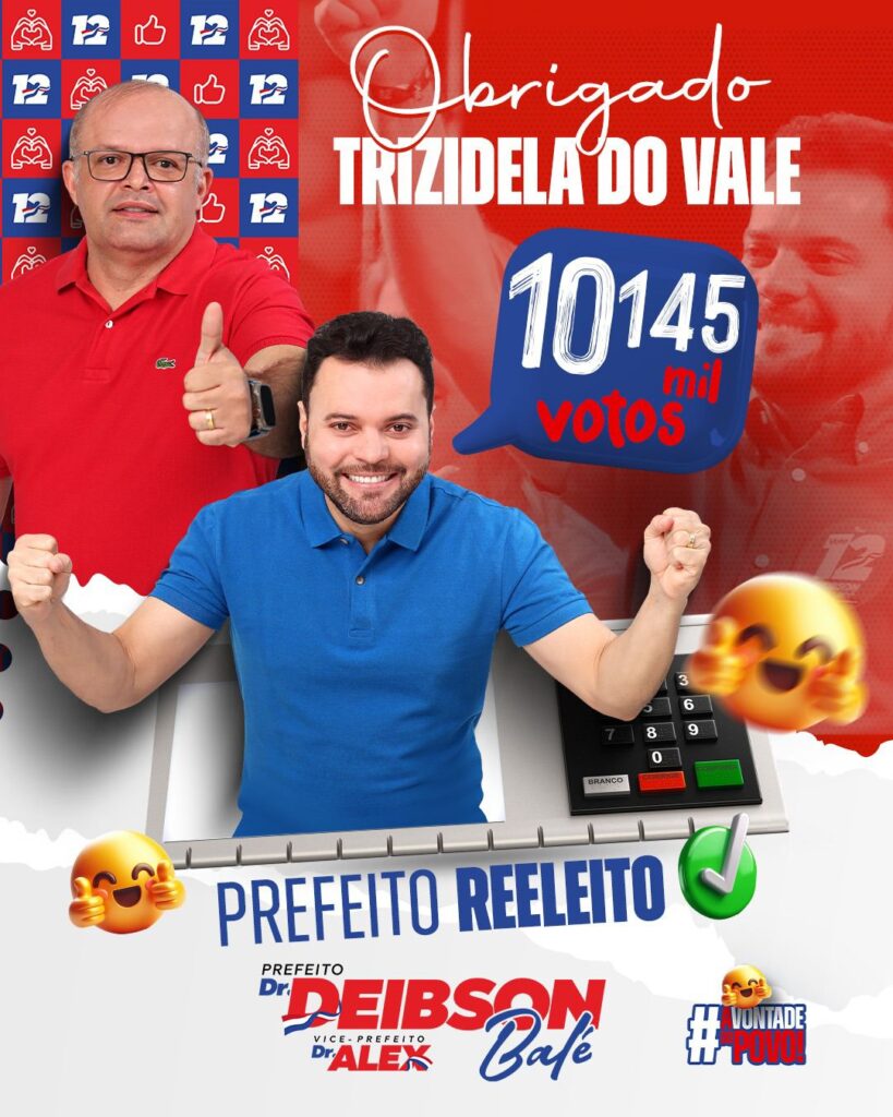 Deibson Balé (PDT), foi reeleito prefeito de Trizidela do Vale/MA com uma ampla vantagem, alcançando 74,16% dos votos válidos. A vitória expressiva confirma forte apoio da população à sua gestão e às mudanças implementadas ao longo de seu mandato.