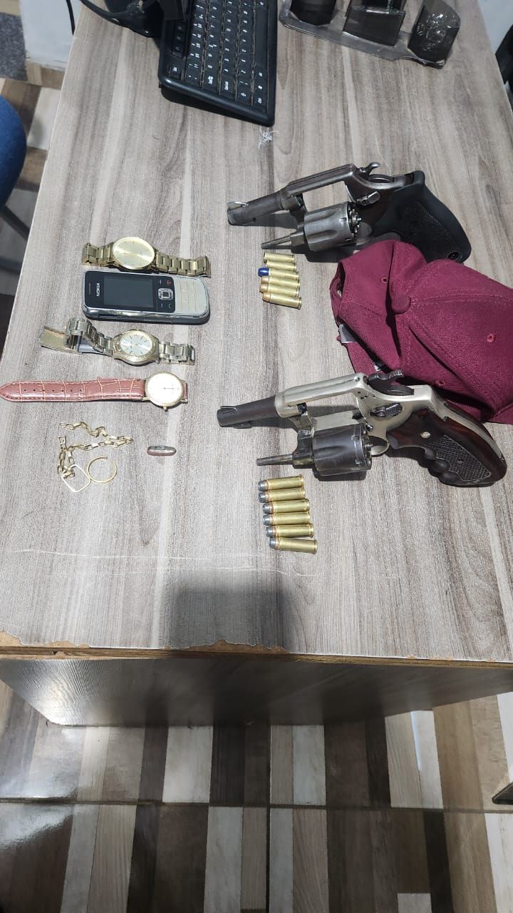 A PM encontrou armas, munições e alguns objetos possivelmente do assalto, após várias buscas em uma das residências que eles entraram, em Lima Campos.