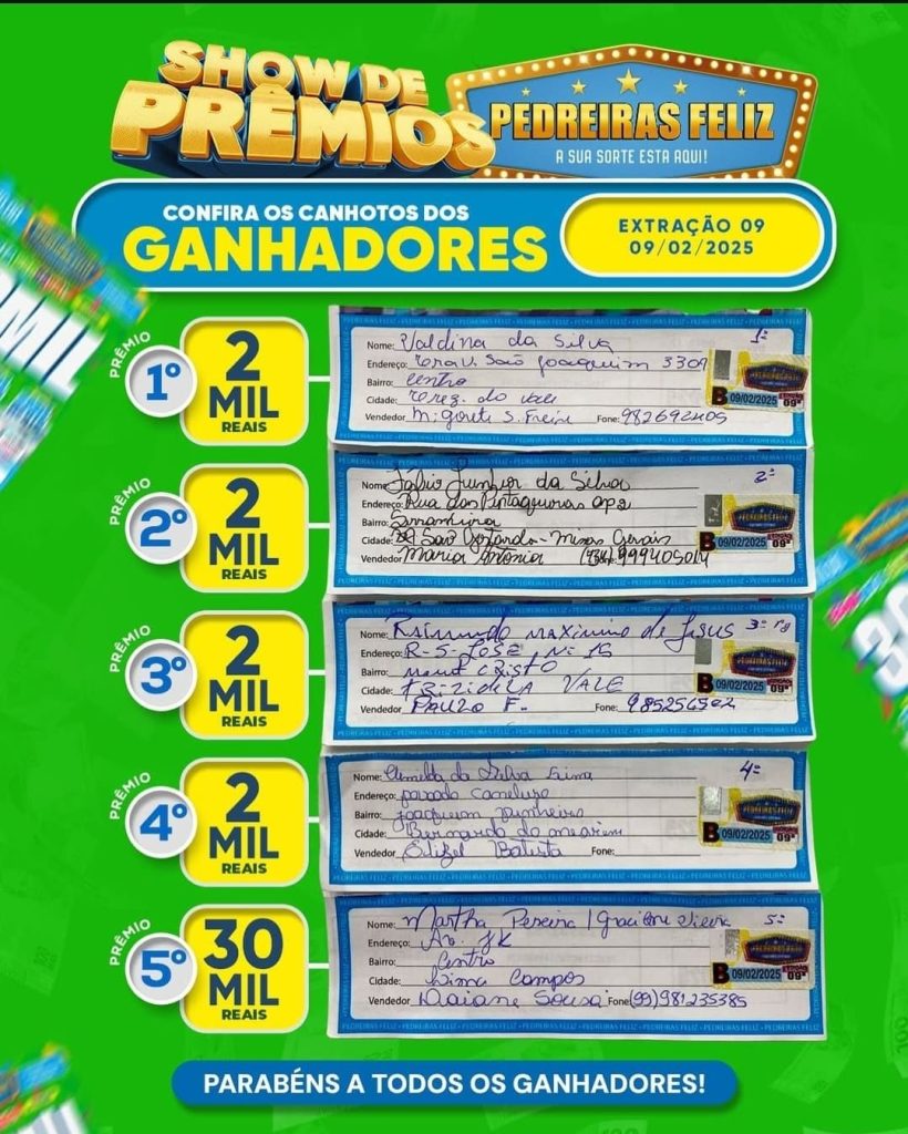 O ganhador de Lima Campos-MA ganhou 30 mil reais e os demais ganharam 2 mil reais cada. Continuem comprando porque aqui tem transparência e credibilidade.