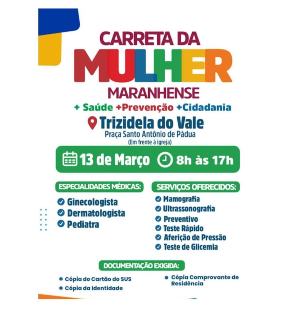 A Prefeitura de Trizidela do Vale – MA, informa que, no dia 13 de março, das 8h às 17h, a Carreta da Mulher Maranhense estará na Praça Santo Antônio de Pádua, em frente à Igreja, oferecendo atendimentos médicos e exames gratuitos para a população.
