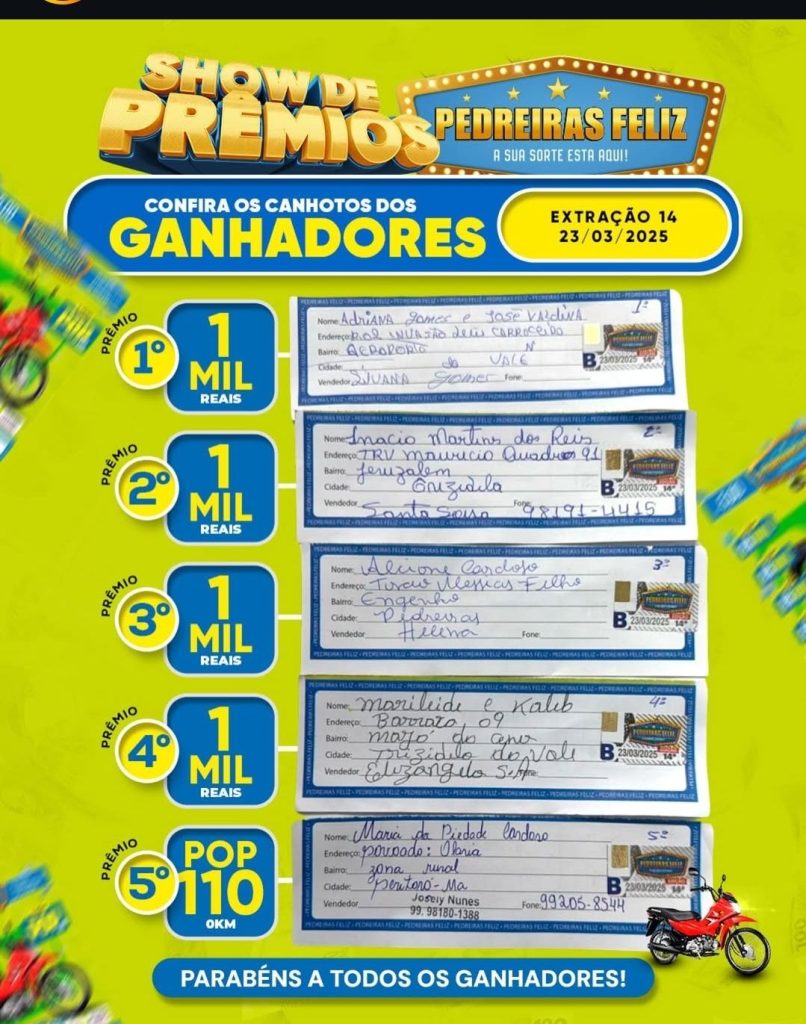Nesse domingo 23, aconteceu o sorteio da 14ª extração do PEDREIRAS FELIZ, e teve 3 ganhadores de Trizidela do Vale uma pessoa de Pedreiras e sortudo de Peritoró que ganhou uma biz 110 0km.