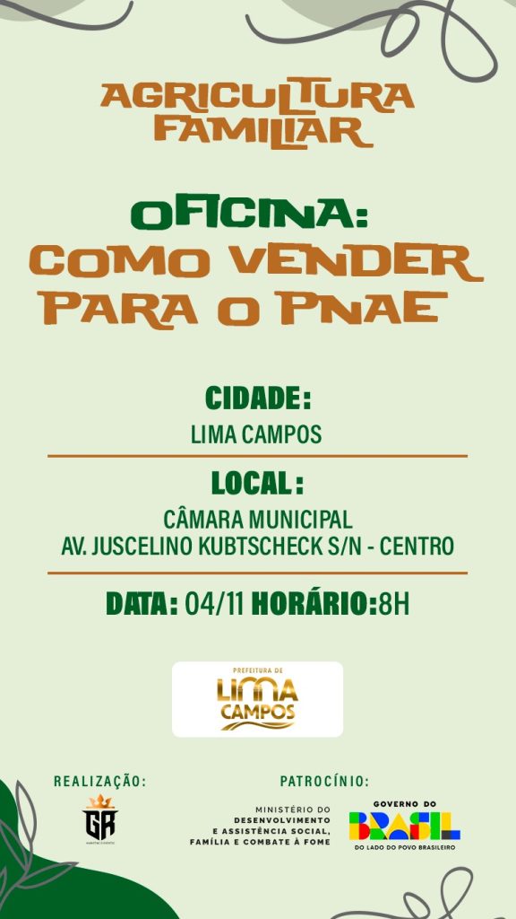 Agricultores familiares de Lima Campos e região terão a oportunidade de ampliar seus conhecimentos e fortalecer a participação na merenda escolar. No dia 04 de novembro, será realizada a oficina “Como Vender para o Programa Nacional de Alimentação Escolar (PNAE)”, um importante evento voltado ao incentivo da agricultura familiar e à geração de renda no campo.