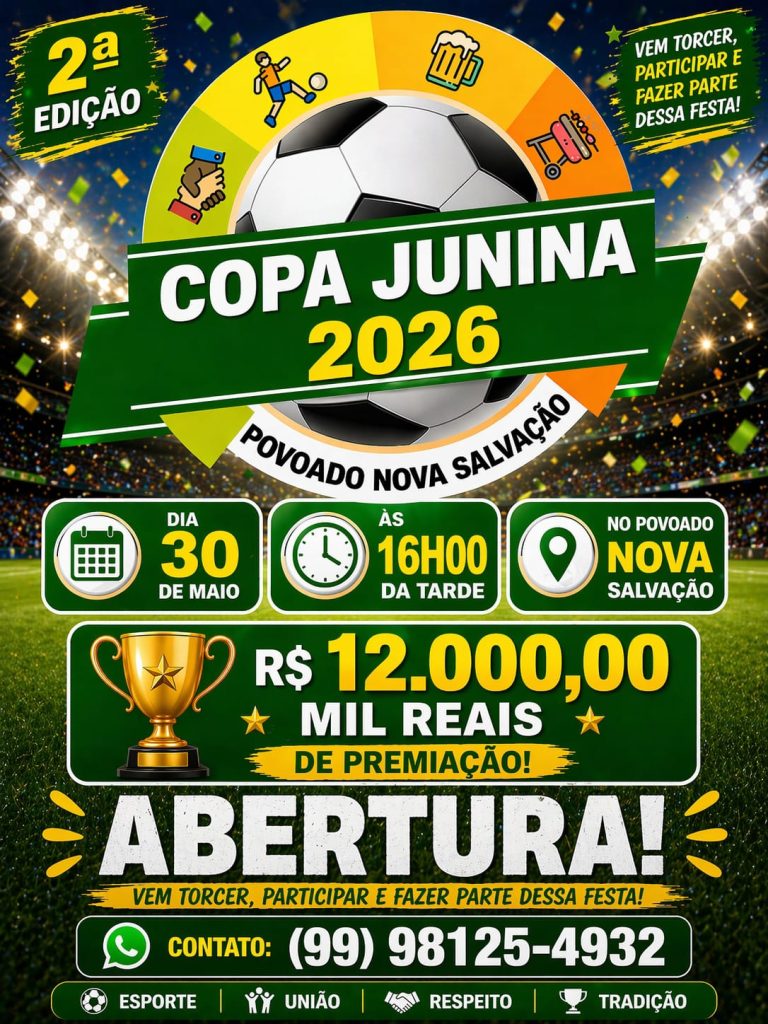 A 2ª edição da Copa Junina 2026 já tem data definida e promete movimentar o povoado Nova Salvação, em Lima Campos, no próximo dia 30 de maio, a partir das 16h, com uma programação voltada ao esporte, lazer e integração comunitária.